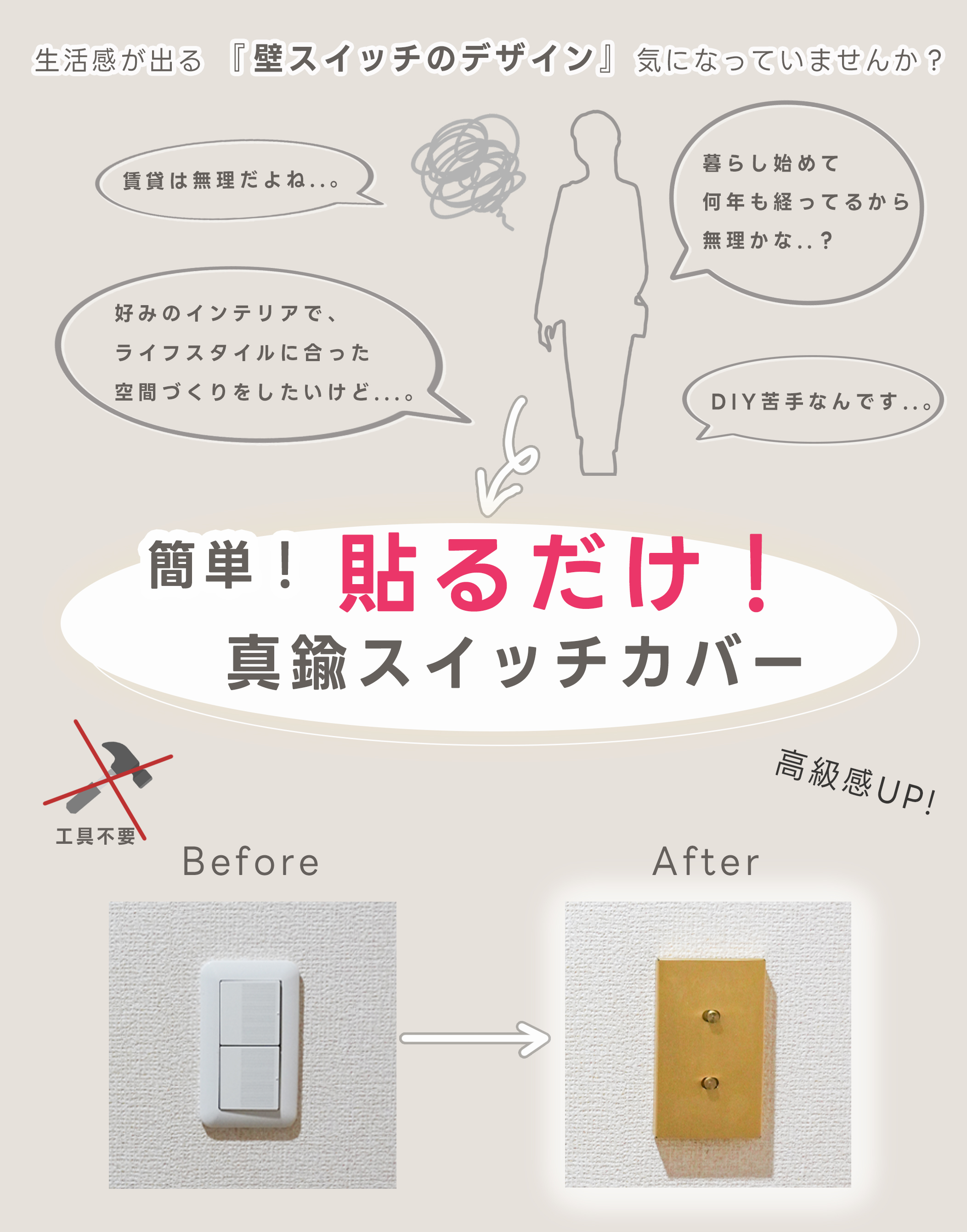 電気工事やドライバーなど面倒な手順は不要で、現在ご使用のスイッチの上から貼るだけなので、新築や注文住宅ではなく、長年住んでるお家にも取付可能です。