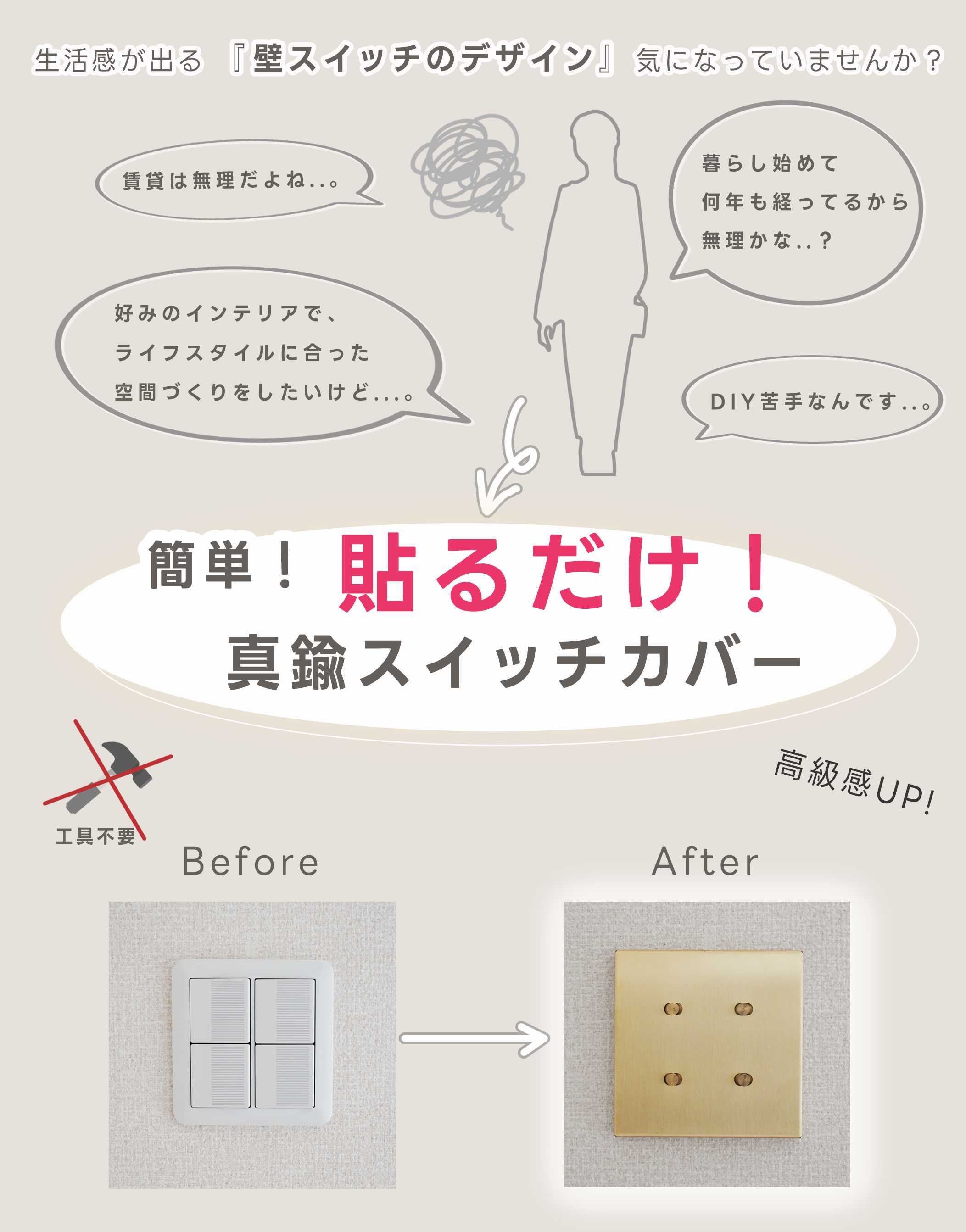 生活感溢れる壁スイッチを、簡単にオシャレに着替えて理想のインテリアに近づけてみてはいかがでしょうか。
