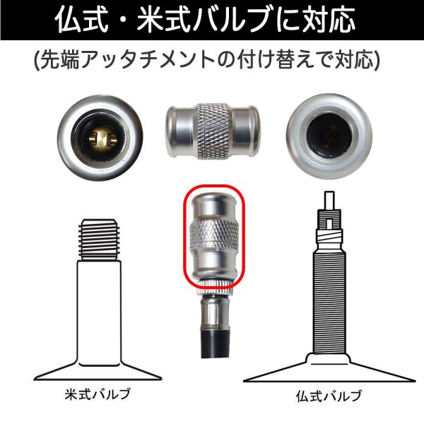 【仏式・米式バルブに対応】先端のアタッチメントを付け替えることにより、仏式・米式どちらのバルブにも対応出来ます。