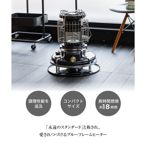 永遠のスタンダード」と称され、90年以上愛され続ける ブルーフレームヒーターの青い炎を囲み、 “暖をとりながら料理もしたい”というお客様の声をかたちに するため開発しました。 伝統の青い炎・心地よい暖かさはそのままに、煮炊きとしても 使えるように調理性能を追求し、サイズもコンパクトにして 使いやすさを実現しました。 SPEC 使用燃料 灯油(JIS1号灯油) 発熱量・暖房出力 2.4kW/h 本体重量 約8.3kg タンク容量(消費量) 4.1L(0.23?/h) 安全装置 対震自動消火装置 連続燃焼時間 約17.8時間 点火装置 × 着脱方式 × 付属品 しんクリーナー、専用収納袋 爆買