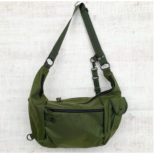 付属のサブストラップで身体に完全固定する事が 出来るので、バイクや自転車に乗った際にも安心です。 メインコンパートメントの他に3つのポケットがあります。 見た目よりかなり容量が有り、厚手の上着(MA-1程度)が 十分に収納出来ます。 1泊程度の旅行やツーリングにも十分対応出来る サイズです。 MATERIAL コーデュラナイロン/コットン/スペクトラ SIZE(縦横厚) 約25×54×17cm