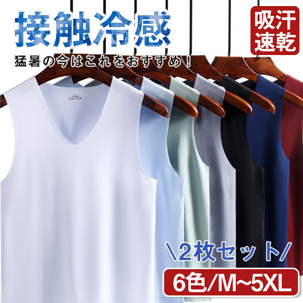 タンクトップ メンズ インナー トップス ノースリーブ ひんやり 涼しい 接触冷感 Vネック クールビズ 汗対策 下着 2点セット 快適 無地