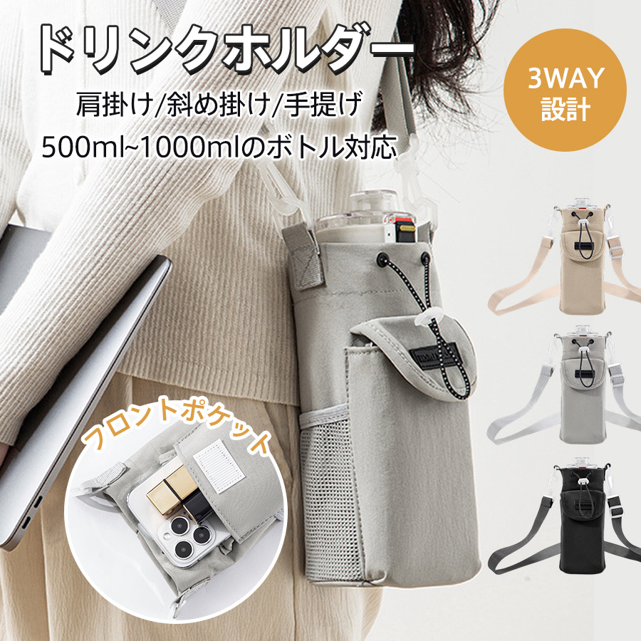 ボトルホルダー ドリンクホルダー ショルダー付き 水筒カバー スマホポーチ 肩掛け 斜め掛け 手提げ 500ml-1000ml 3way 小物入れ