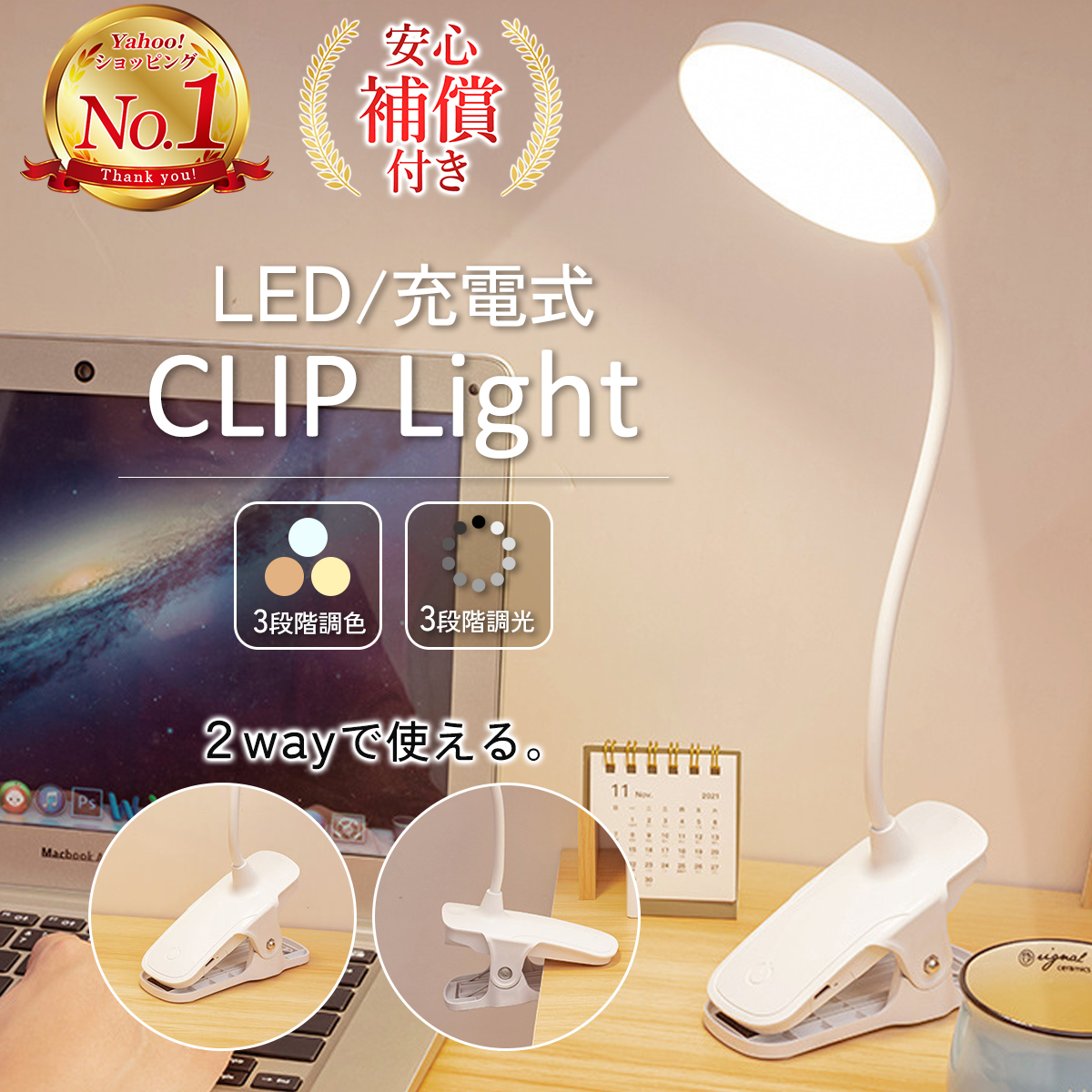 クリップ式で充電タイプだから、ベットや机、本棚など場所を選ばず使えます。