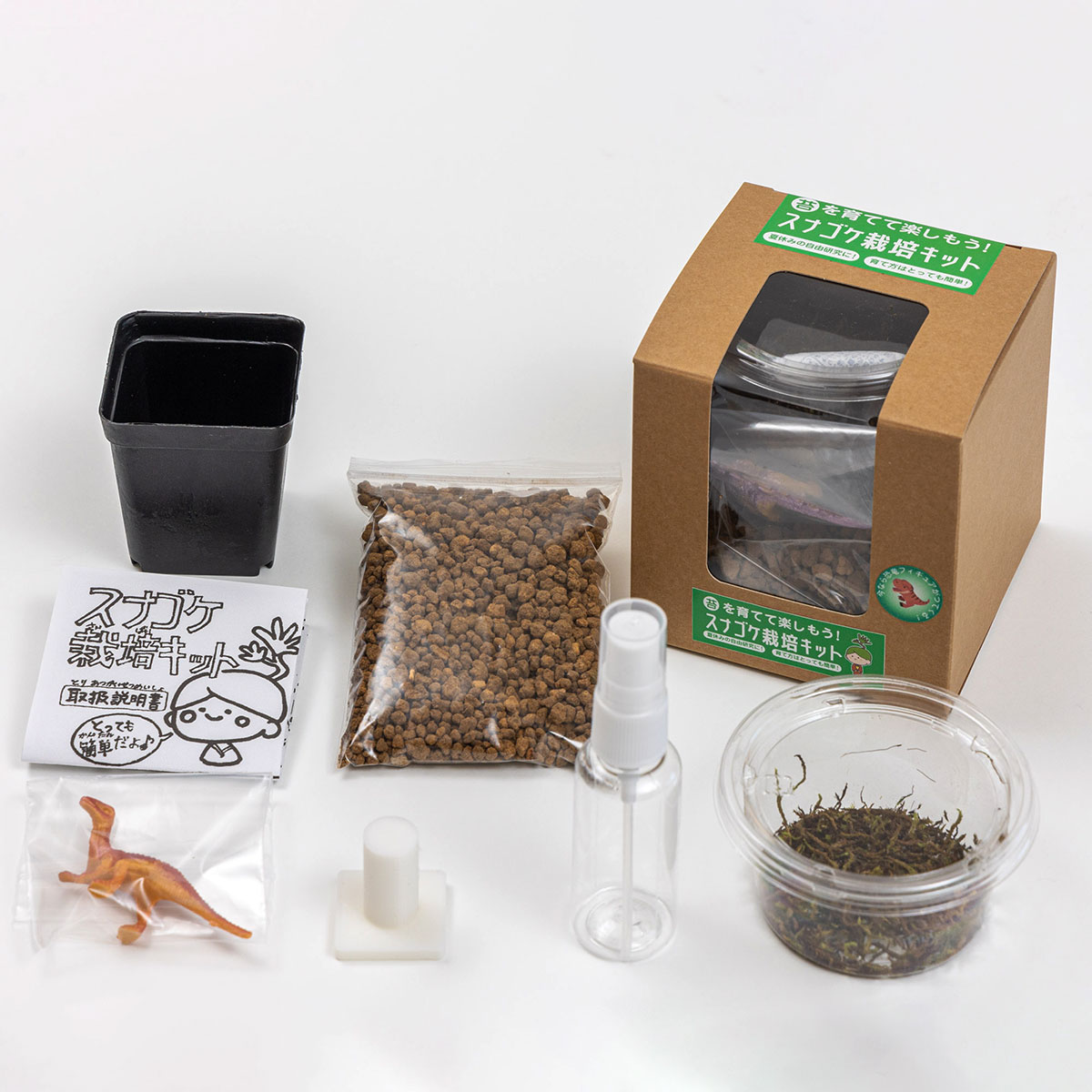 苔(乾燥スナゴケ)・栽培土・栽培容器・水やり用のスプレーボトル・説明書など、栽培に必要な材料をフルパッケージにしたものです。