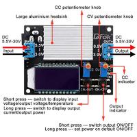 他の機能---表示されたパラメーターを切り替え、出力のオン/オフを設定するボタン付き。 CCおよびCVポテンショメータ付き。 保護ケース付き(自分で組み立てる必要があります); LCフィルター付き。