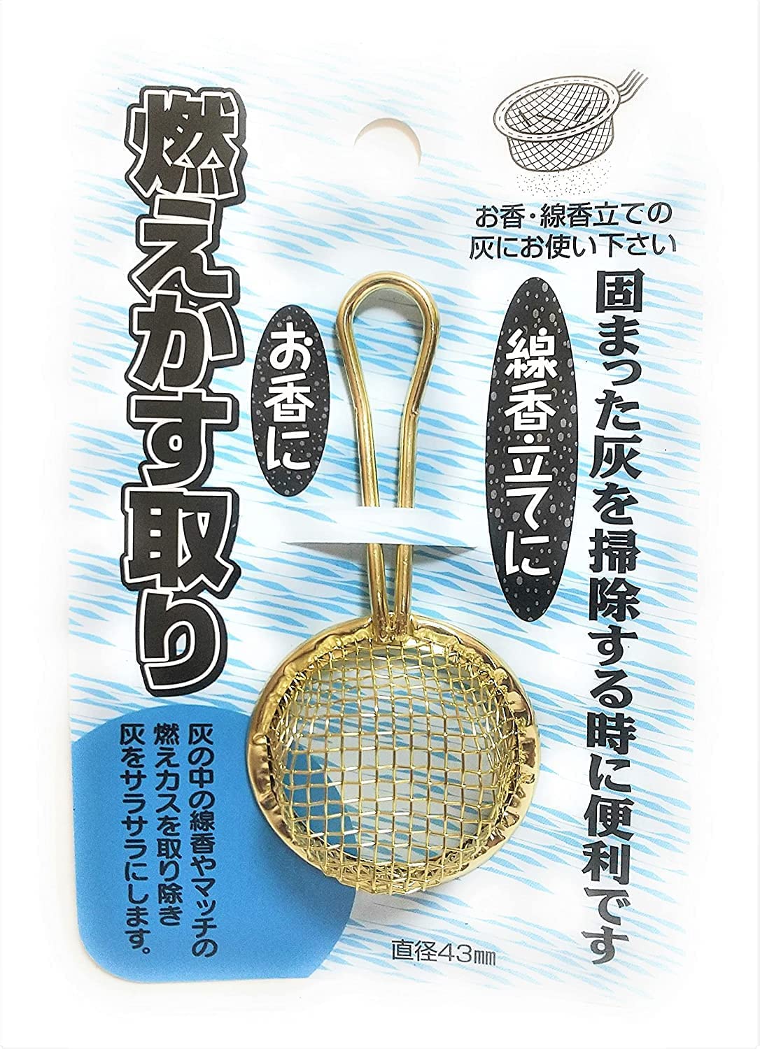 線香立て、線香皿、香炉などの灰を清掃するため道具です。 本体の柄を手で持ち、網の部分で灰をすくってから本体を線香立ての上で軽く振り動かします。 結果、灰は網目から線香立ての中に落ち、灰中の燃え残り等が網の中に残ります。