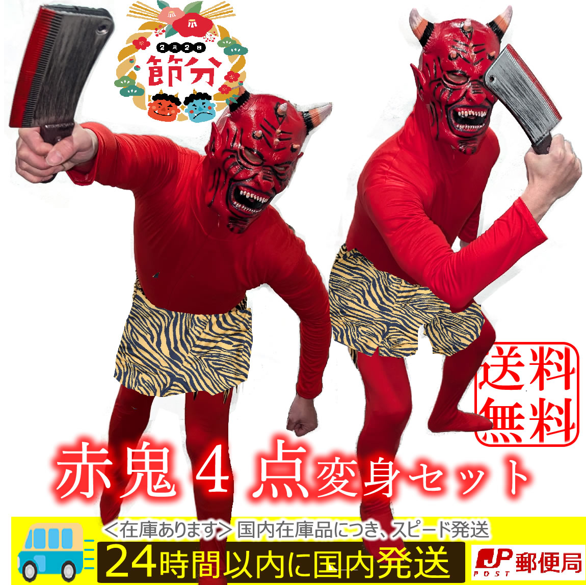 節分 鬼 コスプレ 赤鬼レッド(4点フルセット) 豆まき ハロウィン イベント 被り物 はんにゃ