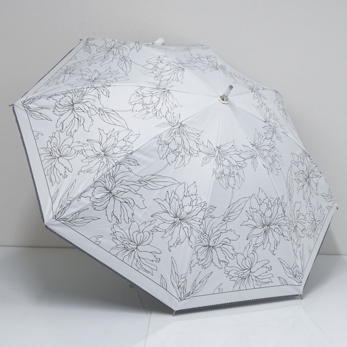 ホワイトの生地に花柄プリントと縁のスカラップ刺繍が華やかなデザインのパラソルです。