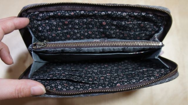 内側には12のカード入れとレシートが収まりそうなポケットが2つとファスナーのついた小銭入れがあります。