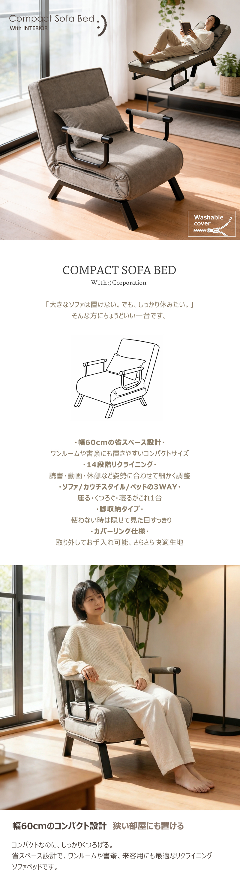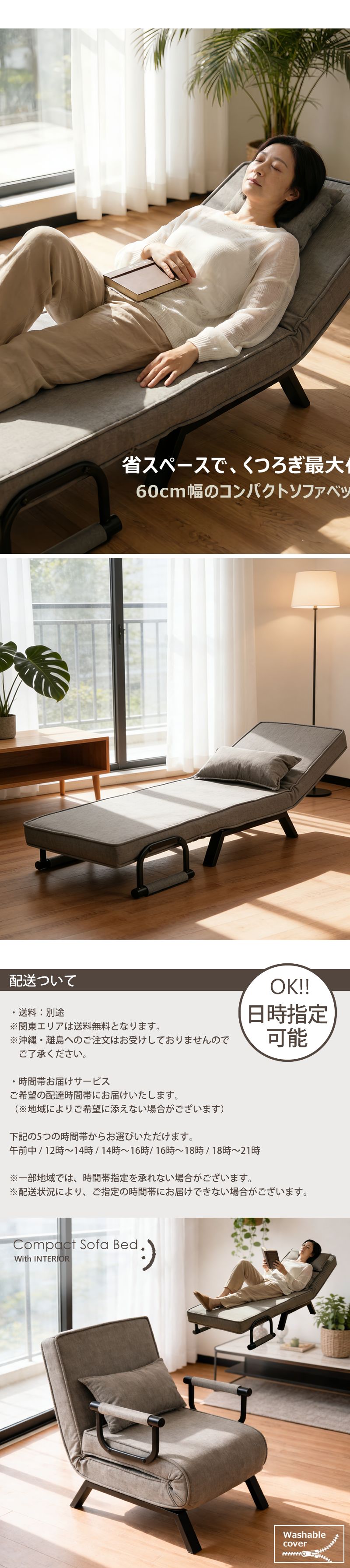 ソファベッド コンパクト 幅60cm 14段階リクライニング カバーリング仕様 脚収納式 さらさら生地 1人用 ソファ 1人掛け 省スペース msb60