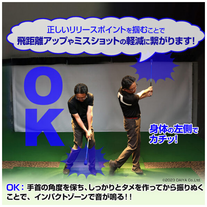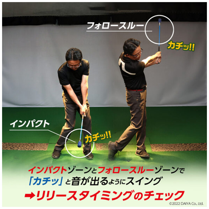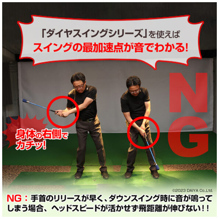 | 累計販売20万本※1のベストセラー練習器具『ダイヤスイング525』の進化版。 近年増えてきている若いゴルファーや女性ゴルファーなど、より多くのゴルファーにとって練習効果が表れやすいように、ヘッドバランス調整による40gの軽量化※2と、「カチッ!」という音がヘッドスピード約20〜25m/sで鳴るように設定値の見直しを実施。 リラックスした無理のない素振り練習を繰り返すことで、スイングリズムやリリースの正しいタイミングを学べます。 全長70cm、重量は500gと一般的なクラブよりも短く、スイングしやすくなっており、室内での練習も可能です。自分のスイングをラウンド前夜に確かめたい、そんな不安を感じた時でも自宅で音を確認しながら気軽にスイング確認できます。 『ダイヤスイングSS』は、スイングが安定していないゴルフ初心者はもちろん、幅広い多くのアマチュアゴルファーがスイングの基礎を習得できるゴルフ練習器具です。 |