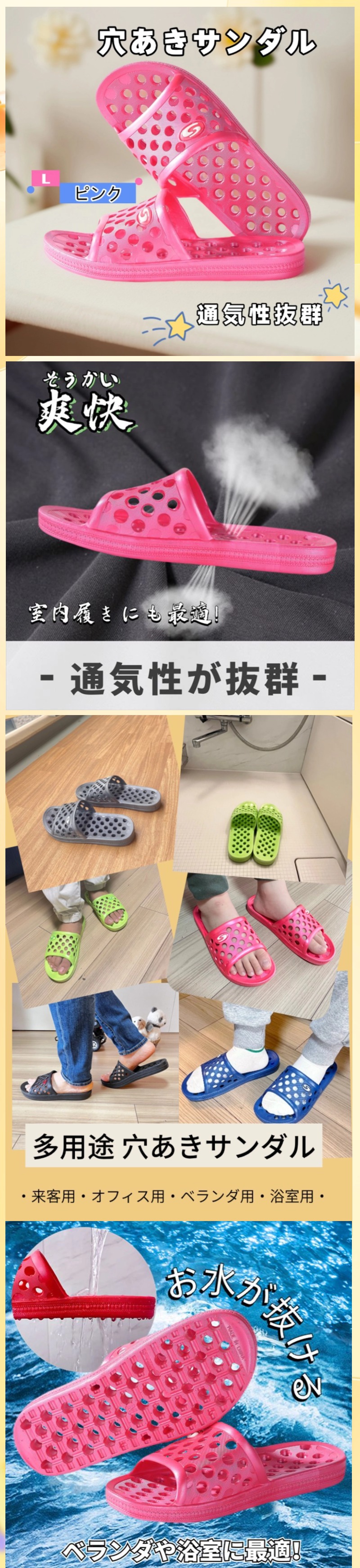 雨が降っても水が溜まらない、風で吹き飛ばされない、真夏の直射日光が浴びても変形しにくい、程よい重みの穴あきPVC素材サンダル。