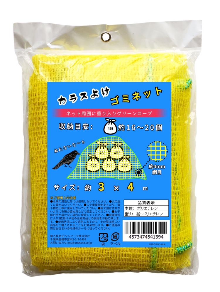 カラスよけネット ゴミネット 3×4m 45L ゴミ袋 約16〜20個分 使用目安 黄色 ネット周囲 4辺 重り入り カラス対策 ゴミ置き場ネット ゴミネット黄色 カラスよけ 防鳥対策 防鳥ネット 防鳥網 カラス避けネット 【結束バンド・紐付き】 爆買