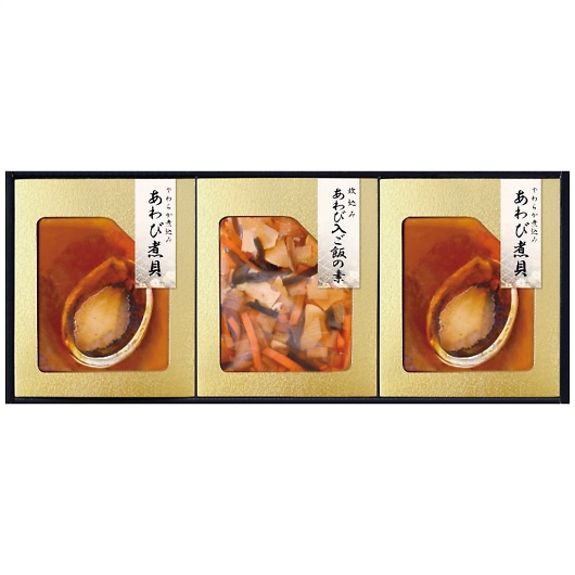 あわびをじっくりと煮上げた「あわびの煮貝」は、ふっくらやわらかく仕上げ、あわびの豊潤な香りをお楽しみいただけます。といだお米と一緒に炊くあわびも入った炊き込みご飯の素とセットになった高級贈答品となっています。
