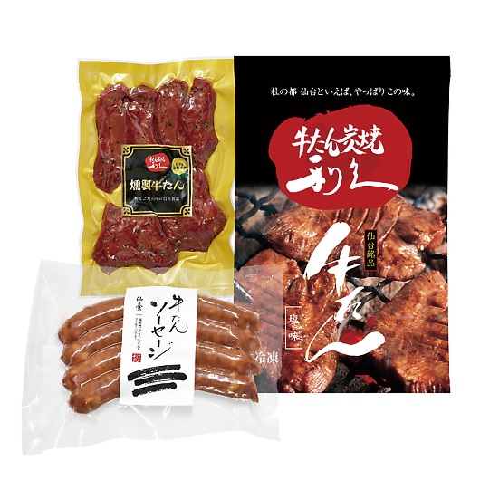 厚切り牛たんと牛たんソーセージ、食べ応えのある燻製牛たん加えたセットです