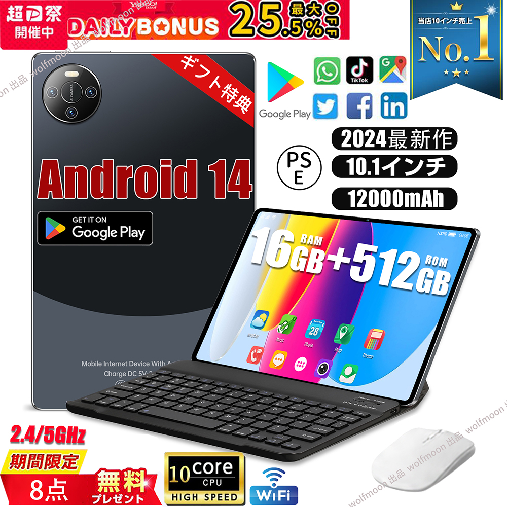 2024最新作 人気 タブレット PC 本体 Android14 wi-fi FullHD 大画面 10.1インチ 16GB+512GB IPS液晶 動画視聴 Bluetooth GPS simフリー 軽量 ネット授業 安い