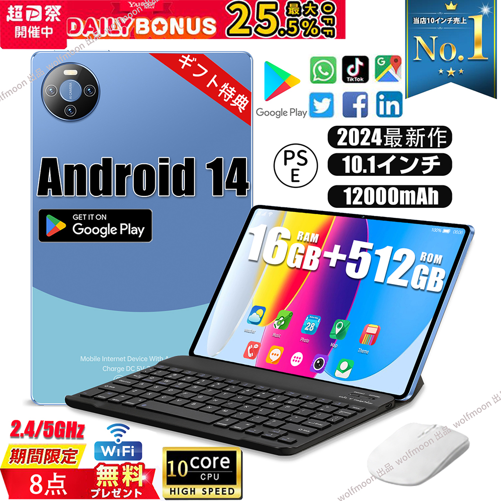 【2024年超高容量 タブレット PC16GB+512GB拡張ストレージ&長持ちバッテリー】この10.1インチタブレットは8GBRAMのランニングメモリと128GBROMの高速ストレージを搭載し、沢山のムービーや漫画、電子書籍、写真、仕事のフャイルなどを保存する事ができます。 マイクロSDカード(別売)、容量を気にせず、好きなアプリをダウンロードして、映画、音楽、ドラマ、Kindle、写真などを思う存分お楽しみいただけます。12000mAh大容量バッテリー内蔵して、通常使用で最長8時間の長稼働バッテリーでテレビ番組の視聴・読書・Webサーフィンを思う存分に楽しめます!。長持ちバッテリーで出張や通勤電車やスキマ時間でも短距離旅行でも適します。タブレットAndroid 14システム +高性能10コアCPU】E60 Android13どAndroid14 タブレット10インチは最新Android システム(PSE認証済)を搭載、超高性能 10コアプロセッサを採用、高コスパのタブレットです。 この10インチタブレットは、超強いオクタコアの8CPUを搭載し、最大1.8Ghzの処理能力を発揮します。お好きな軽いゲームのプレイ、オンライン会議及び授業、スムーズなマルチタスク体験が可能。またAndroid 12よりも50%速くアプリを起動します。プレインストールされたGoogle Play Storeで沢山の最新Androidアプリ、ゲーム、音楽、映画、TV、書籍、雑誌などにアクセス可能。