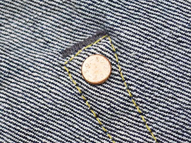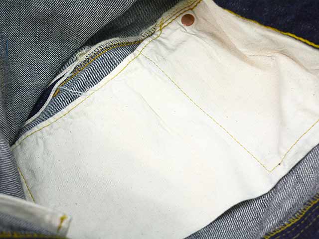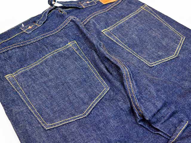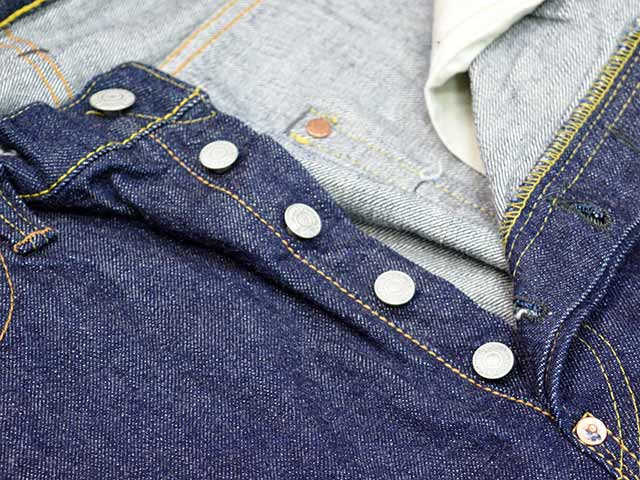 ジーンズの歴史的にサスペンダーで吊る時代から、ベルトを使用する人が大半を占めるようになったことからサスペンダーボタンが廃止されたことと、自動車の普及によりヒップポケットのむき出しリベットによってシートに傷がつくといった理由から、隠しリベットが採用された時期のモデル。