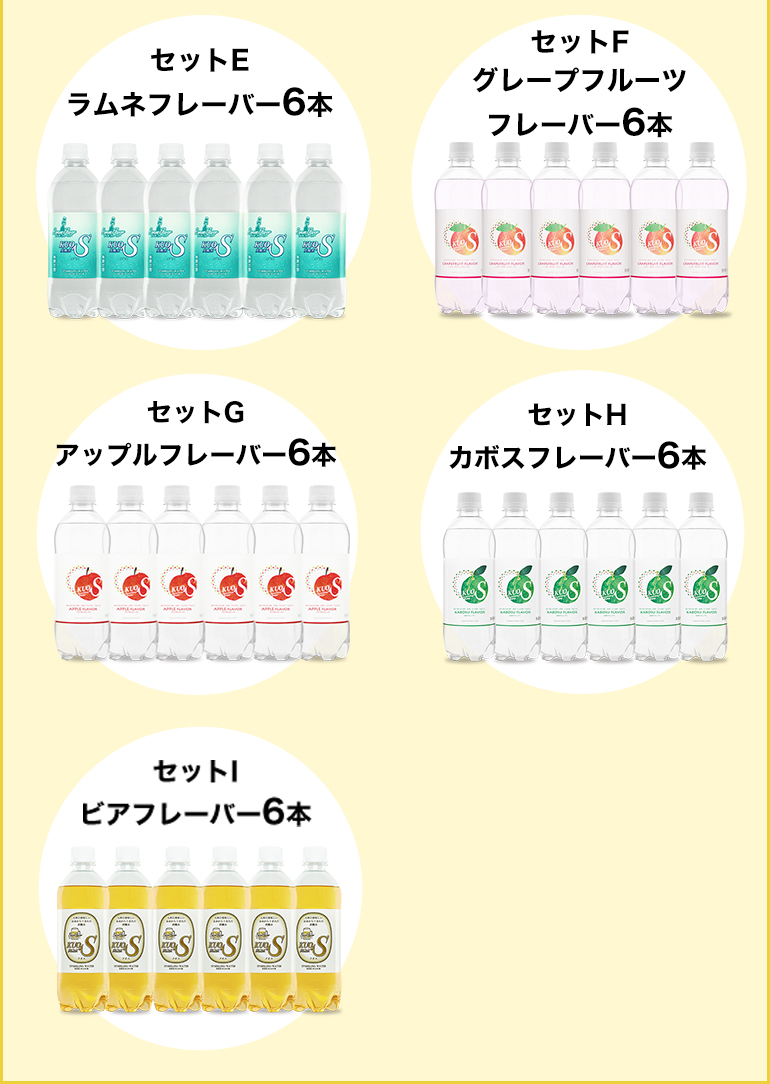 ・プレーン、アップル、カボス、ラムネ、グレープフルーツ、ビア、ソルビアンカ のお試し6本セットです。