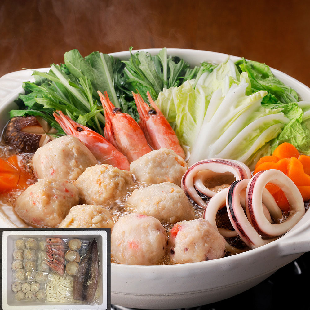 「かに入つみれ」・「えび入つみれ」・「とりごぼうつみれ」・「たこ入つみれ」など、ボリュームいっぱいのつみれを主役に「えび」や「いか」等の魚介を詰め合わせました。「4種のつみれ」と「各具材」の旨味が鍋いっぱいに広がります。ご自宅の野菜も一緒に煮込んでからお楽しみください。