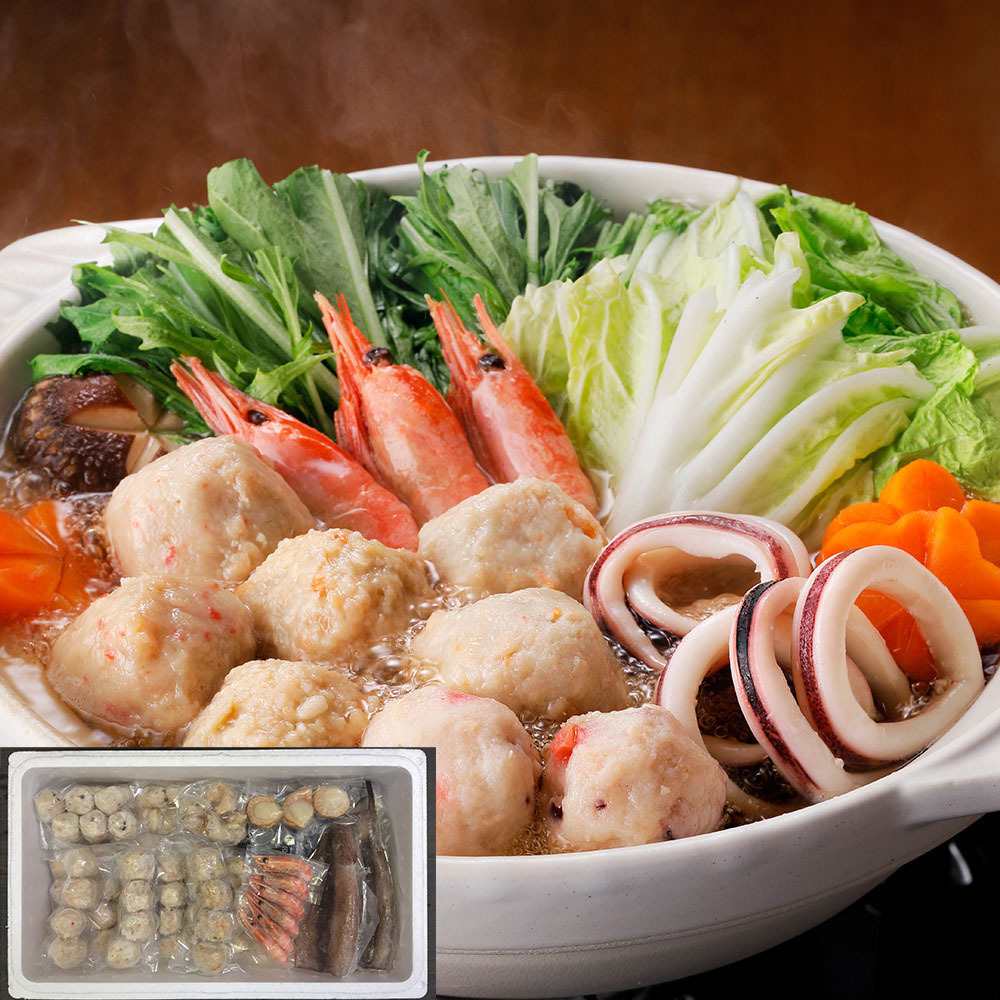 「かに入つみれ」・「えび入つみれ」・「とりごぼうつみれ」・「たこ入つみれ」など、ボリュームいっぱいのつみれを主役に「えび」や「いか」等の魚介を詰め合わせました。「4種のつみれ」と「各具材」の旨味が鍋いっぱいに広がります。ご自宅の野菜も一緒に煮込んでからお楽しみください。