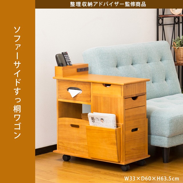 ワゴン テーブル サイドテーブル 小物収納 ソファーサイド すっ桐ワゴン コンセント付 桐 キャスター付き リビング収納 幅33