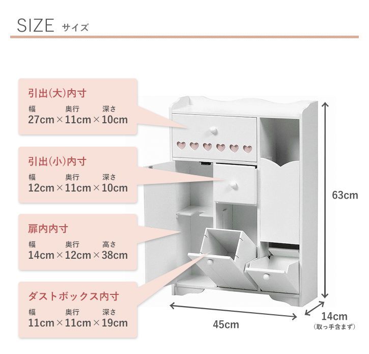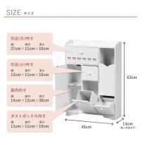 | 補足説明 | ■ 引出内寸(小):(約)幅12×奥行11×深さ10cm■ 引出内寸(大):(約)幅27×奥行11×深さ12cm■ 扉内内寸:(約)幅14×奥行12×高さ38cm■ ダストボックス内寸:(約)幅11×奥行11×高さ19cm |