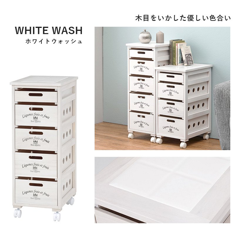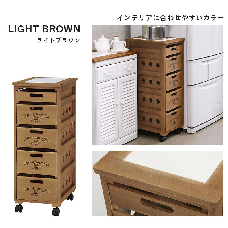 すき間収納 ホワイトウォッシュ 奥行40 キッチンストッカー 幅30 引き出し 白 野菜ストッカー キッチンワゴン 5段 キャスター付き ライトブラウン 高さ79cm