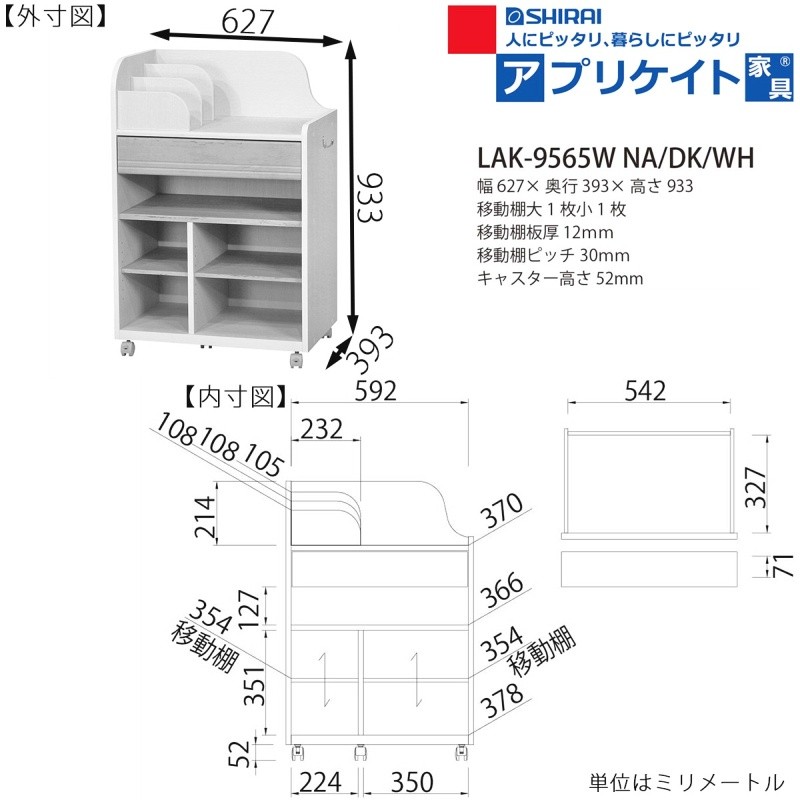 ■素材:【本体素材】プリント紙化粧繊維板:【表面素材】プリント紙化粧繊維板:【異素材】フック:亜鉛合金/キャスター:ナイロン:【特殊加工】天板:ソフトフォーム/引出前板:ラッピング