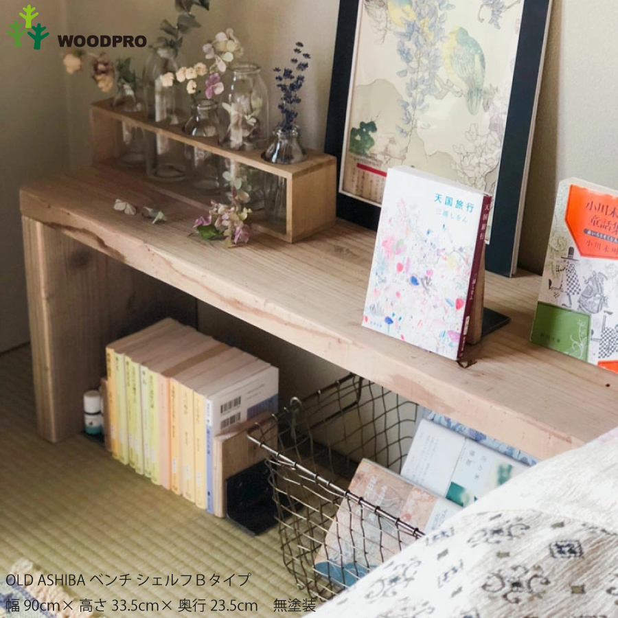 OLD ASHIBA(足場板古材)ベンチ シェルフ Bタイプ(両端の飛び出しなし) 幅900mm×高さ335mm×奥行235mm 無塗装