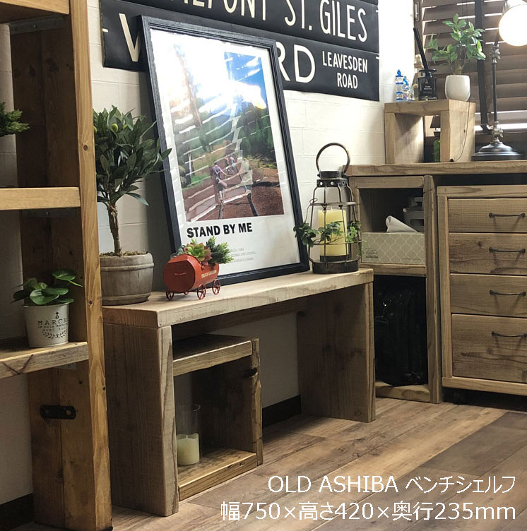 OLD ASHIBA(足場板古材)ベンチ シェルフ Bタイプ(両端の飛び出しなし) 幅750mm×高さ420mm×奥行235mm 無塗装