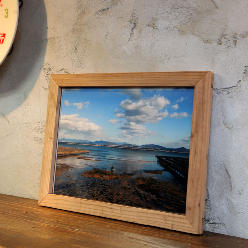 フォトフレームとしてだけではなく、古材のフレームだけをディスプレイに活用しても◎。