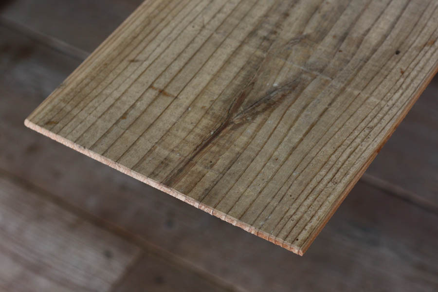 厚み35ミリの古材足場板を5ミリ前後の厚さにスライスしたものです。スライスする前の古材のソリなどの関係で、プラスマイナス2ミリ程度の厚みの誤差はありますのでご了承ください。
