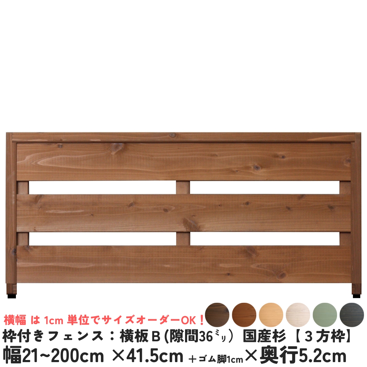 枠付きフェンス:横板B(隙間36ミリ)◇国産杉【3方枠】 幅710〜800mm×高さ415mm+ゴム脚10mm×奥行52mm ●ゴム脚付け加工あり
