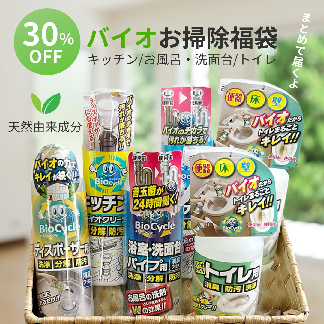 バイオお掃除福袋は、トイレ、お風呂・洗面台、キッチンなど、家中の水回りをしっかりと掃除できるアイテムが揃っています。