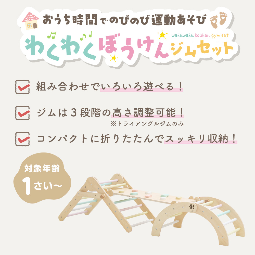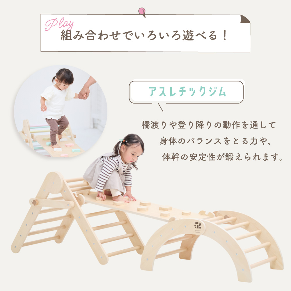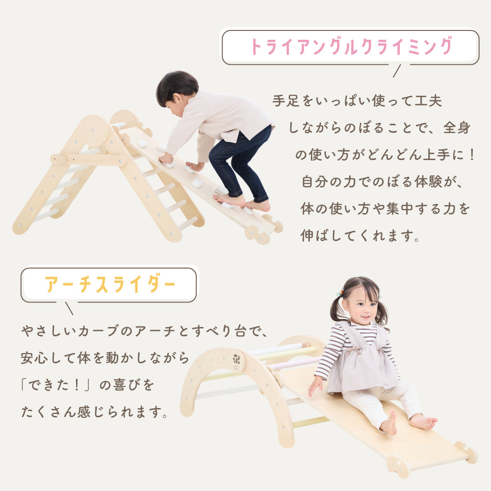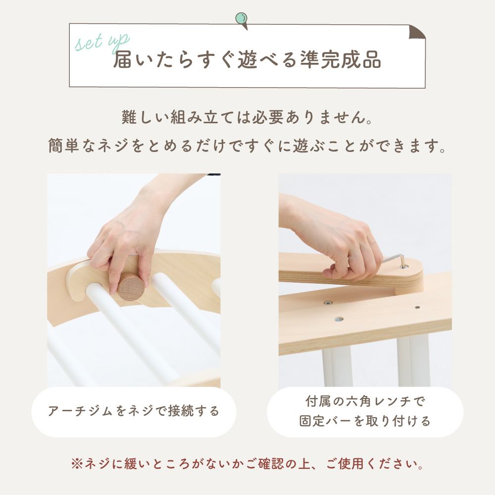 | アーチジム(アーチジムAx1, アーチジムBx1,アーチジム用ねじ(丸)x2),トライアングルジム(ジム本体x1, 固定バーx2, ネジx2, 六角レンチx1, トライアングルジム用ねじ(花)x2), クライミング&スライダーボードx1, 取扱説明書x1 |