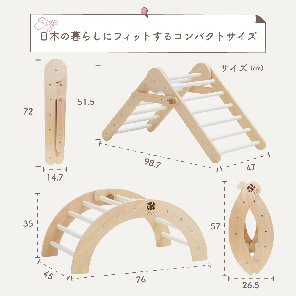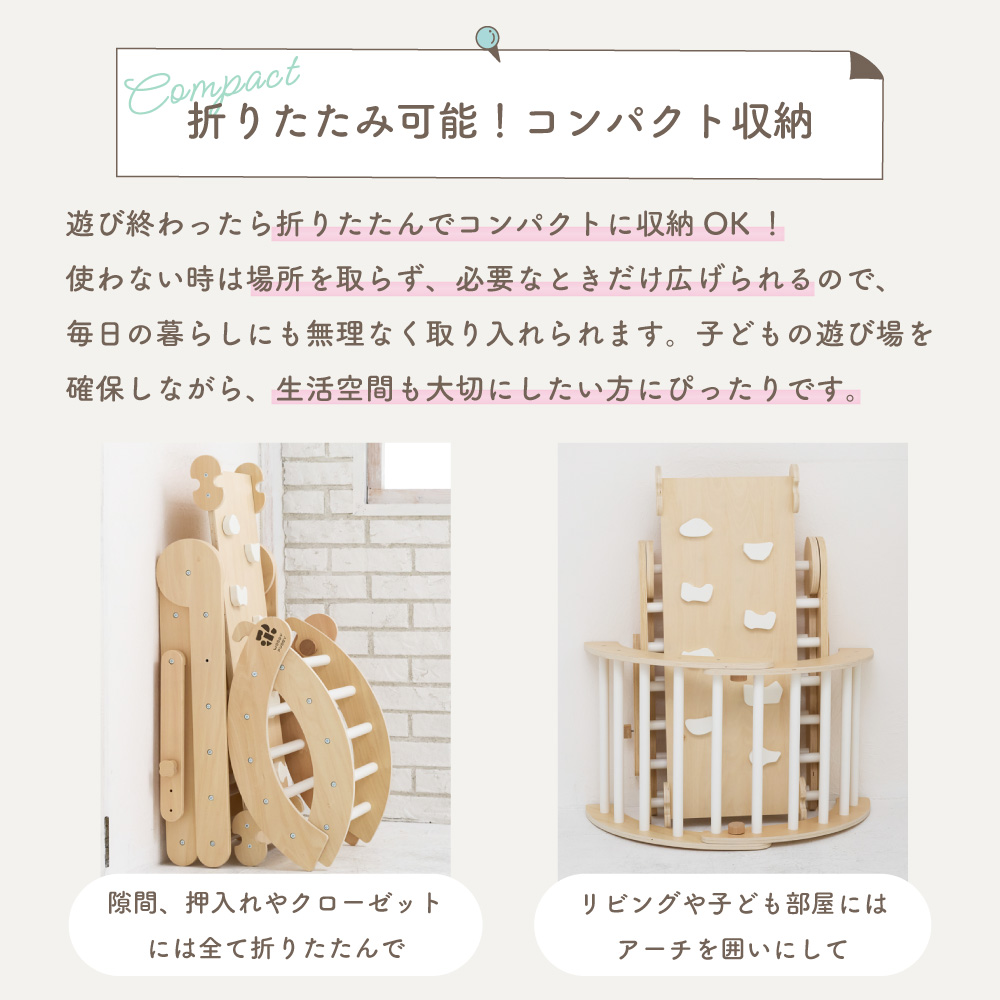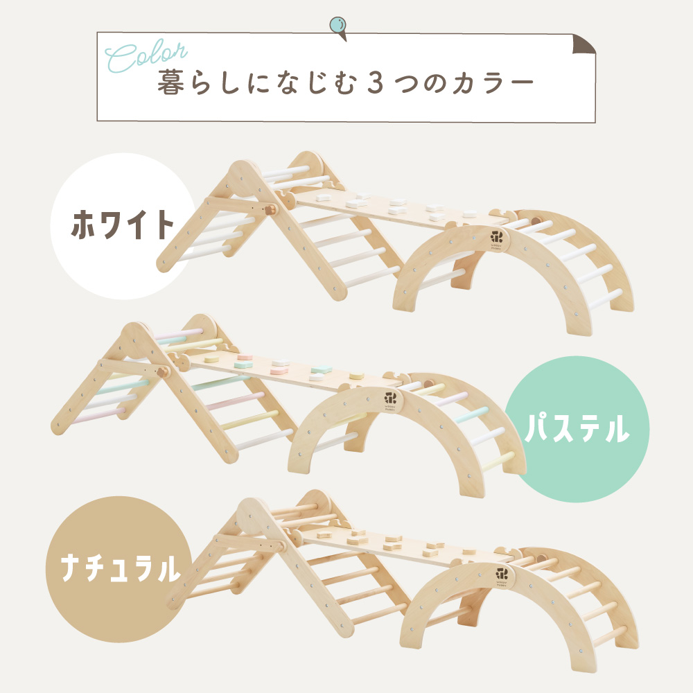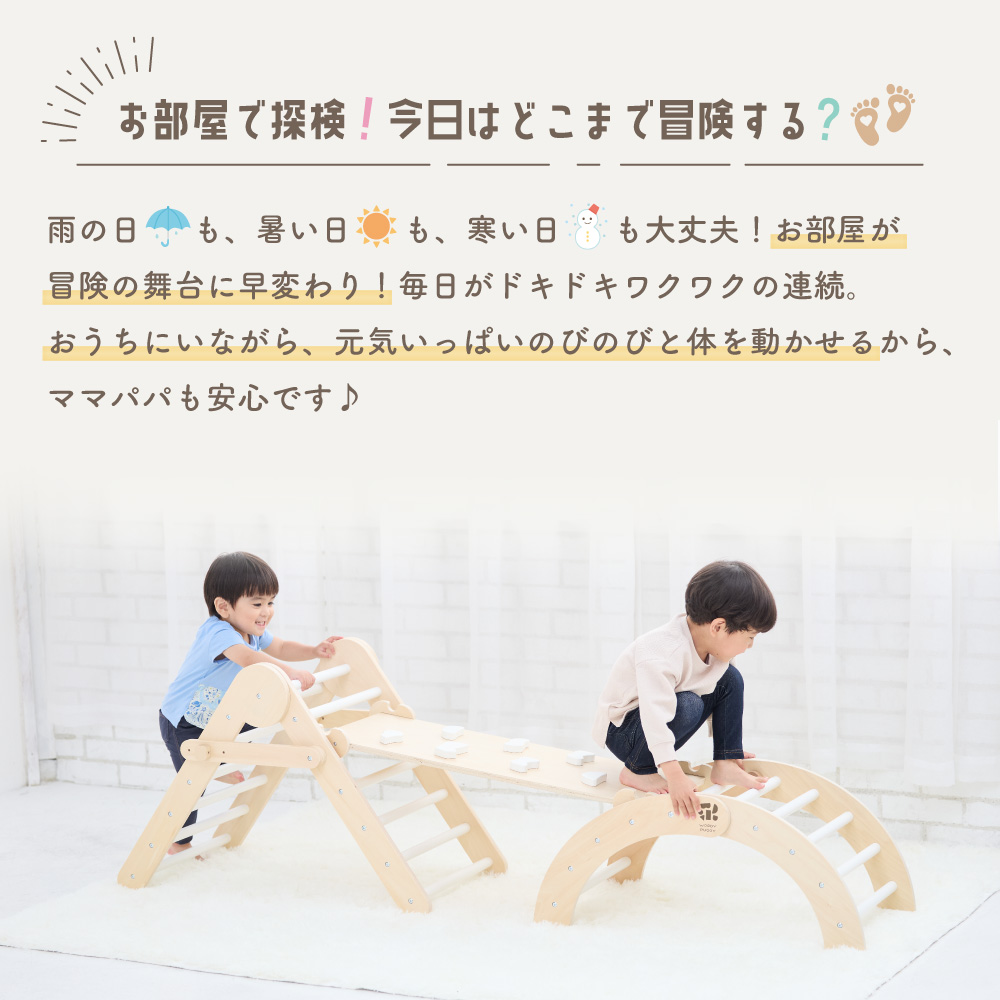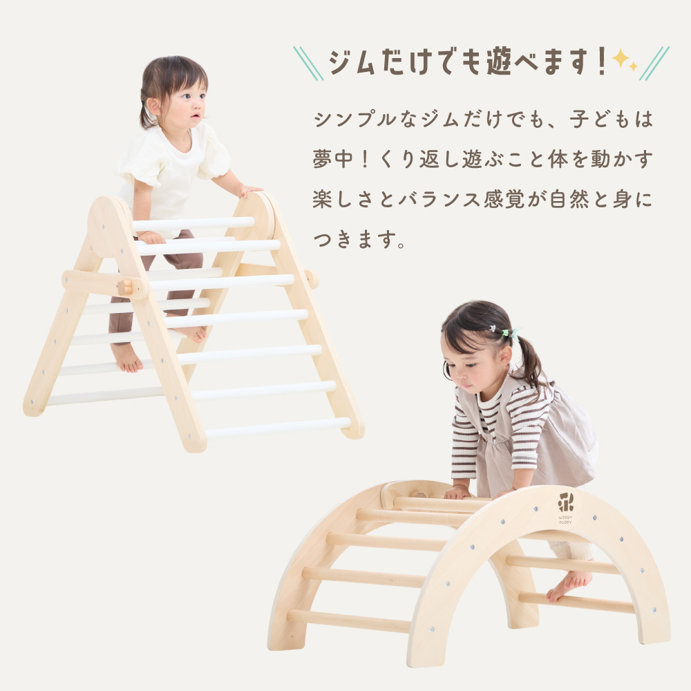 | アーチジム(アーチジムAx1, アーチジムBx1,アーチジム用ねじ(丸)x2),トライアングルジム(ジム本体x1, 固定バーx2, ネジx2, 六角レンチx1, トライアングルジム用ねじ(花)x2), クライミング&スライダーボードx1, 取扱説明書x1 |