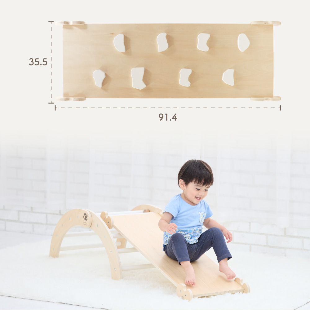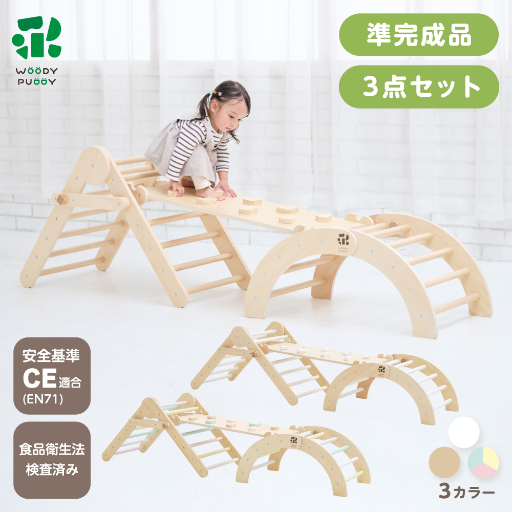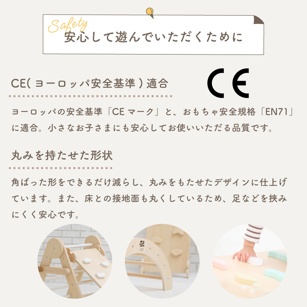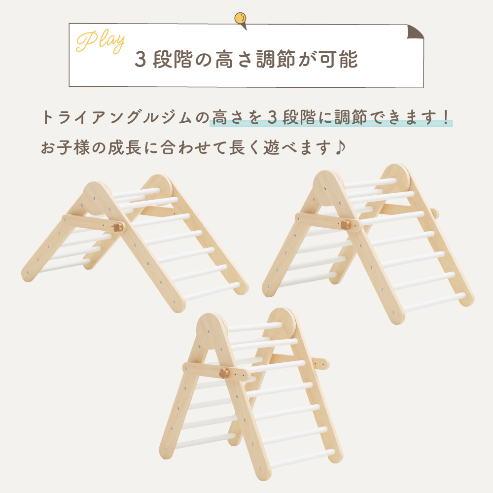 | アーチジム(アーチジムAx1, アーチジムBx1,アーチジム用ねじ(丸)x2),トライアングルジム(ジム本体x1, 固定バーx2, ネジx2, 六角レンチx1, トライアングルジム用ねじ(花)x2), クライミング&スライダーボードx1, 取扱説明書x1 |