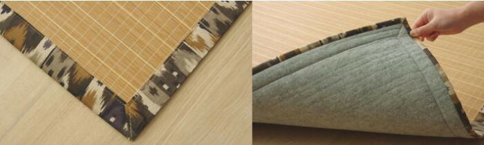 汚れにくく、耐久性に優れています。熱伝導率が高いため、ひんやり感も抜群です。竹部分はシンプルに、ヘリには迷彩柄を使用することでお部屋に敷きやすくしました。