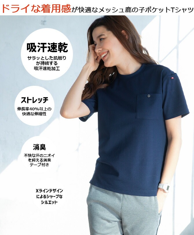 さらっとした触感、ストレッチ、吸水速乾のパフォーマンスを有する鹿の子素材に、通気性、UVカット、消臭テープの機能性を加えた高機能Tシャツです。