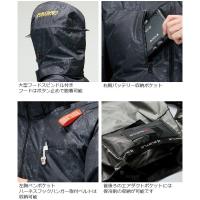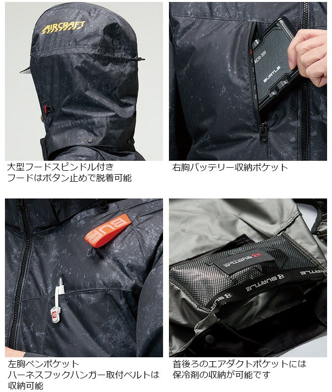 脱着可能なヘルメットの上からかぶれる大型フードをはじめ、フックハンガー、背ランヤードホールを配備しており、フルハーネスにも完全対応しています。