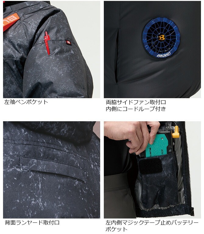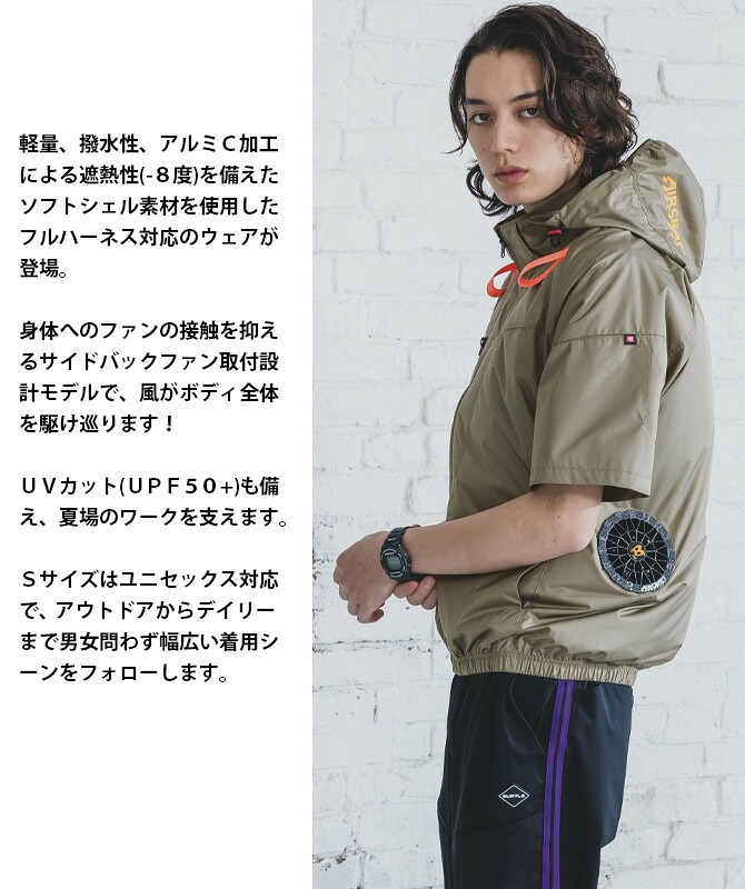 軽量・撥水性・アルミC加工による遮熱性(-8℃)を備えたソフトシェル素材を使用し、背ヨークには保冷剤を収納可能な通気エアダクトポケットを装備しています。