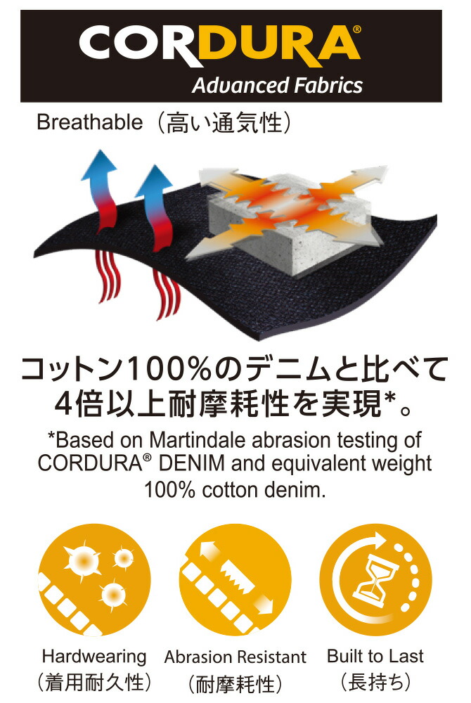 耐久度も必要なバイク用デニムにも使用されているCORDURAデニム生地で驚異の動きやすさ(伸長率25%以上)を実現した、アメイジングストレッチ素材を使用しています。