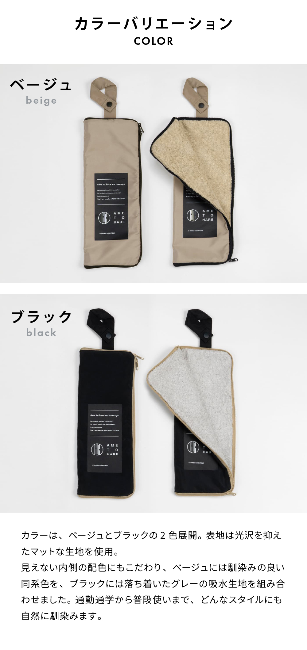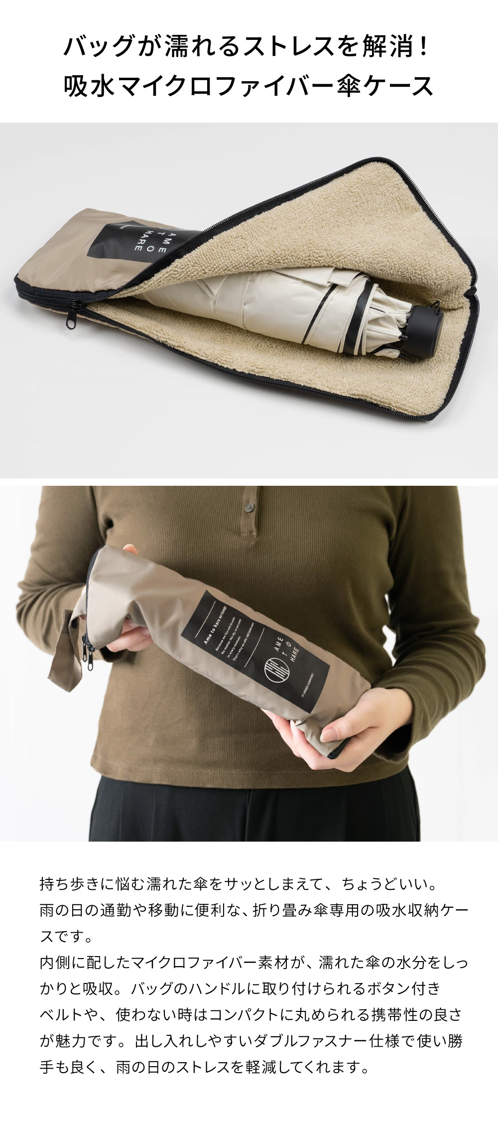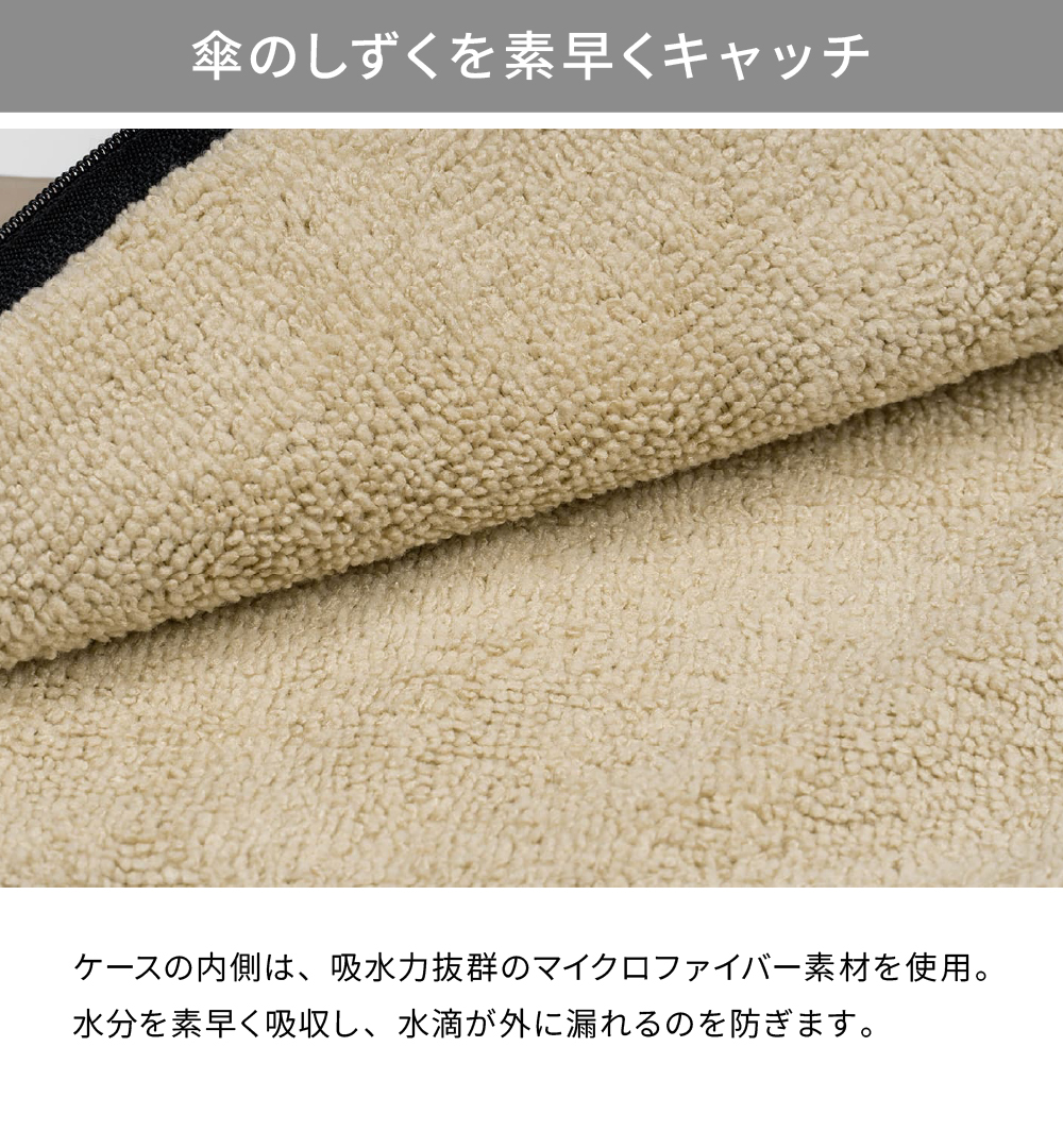 | 持ち歩きに悩む濡れた傘をサッとしまえて、ちょうどいい。雨の日の通勤や移動に便利な、折り畳み傘専用の吸水収納ケースです。 内側に配したマイクロファイバー素材が、濡れた傘の水分をしっかりと吸収。バッグのハンドルに取り付けられるボタン付きベルトや、使わない時はコンパクトに丸められる携帯性の良さが魅力です。出し入れしやすいダブルファスナー仕様で使い勝手も良く、雨の日のストレスを軽減してくれます。 |