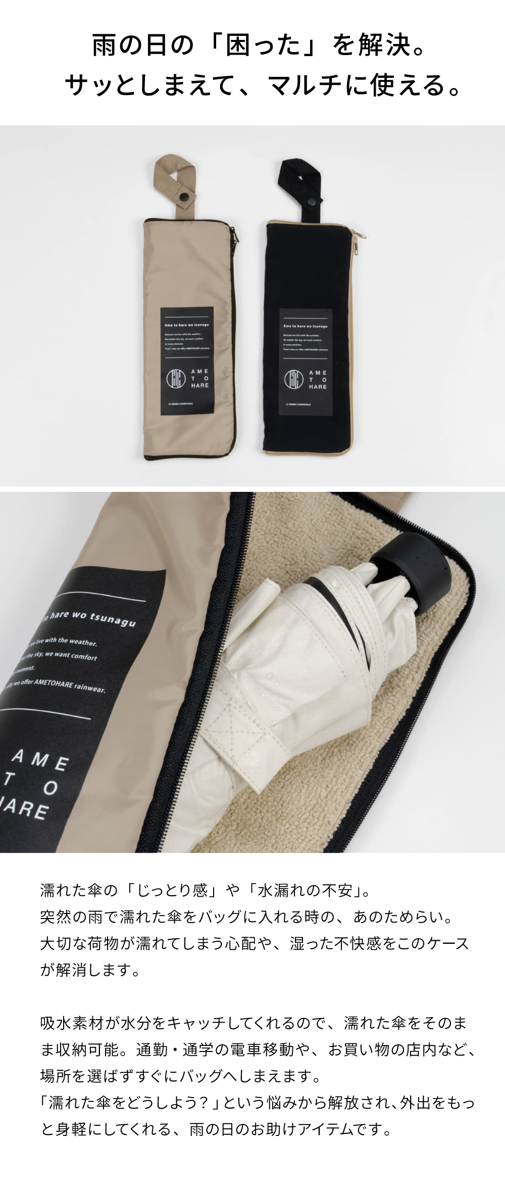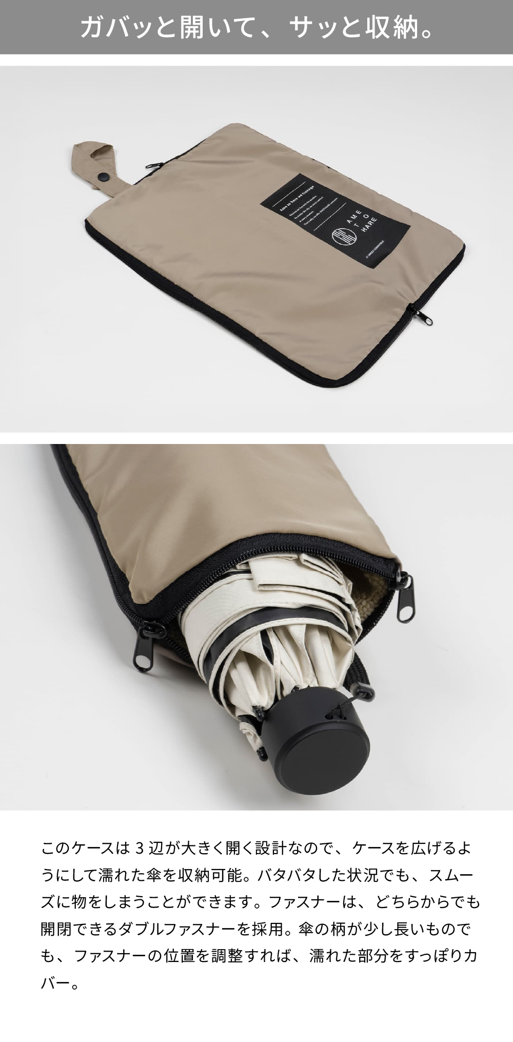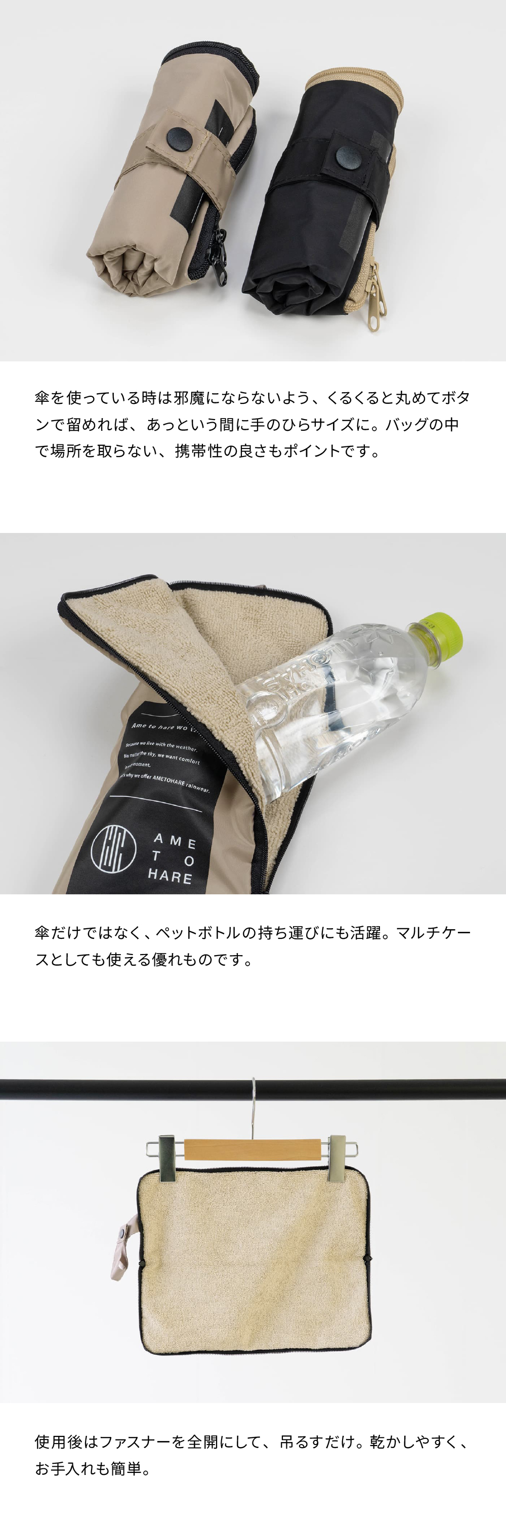 | 持ち歩きに悩む濡れた傘をサッとしまえて、ちょうどいい。雨の日の通勤や移動に便利な、折り畳み傘専用の吸水収納ケースです。 内側に配したマイクロファイバー素材が、濡れた傘の水分をしっかりと吸収。バッグのハンドルに取り付けられるボタン付きベルトや、使わない時はコンパクトに丸められる携帯性の良さが魅力です。出し入れしやすいダブルファスナー仕様で使い勝手も良く、雨の日のストレスを軽減してくれます。 |