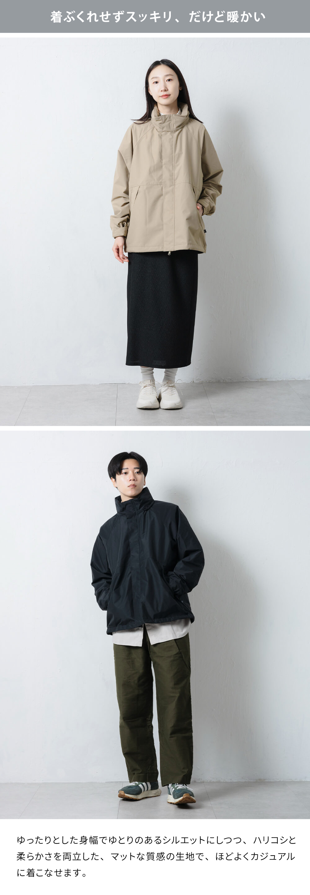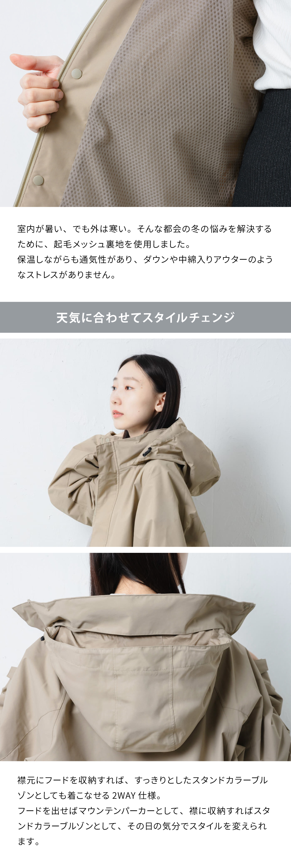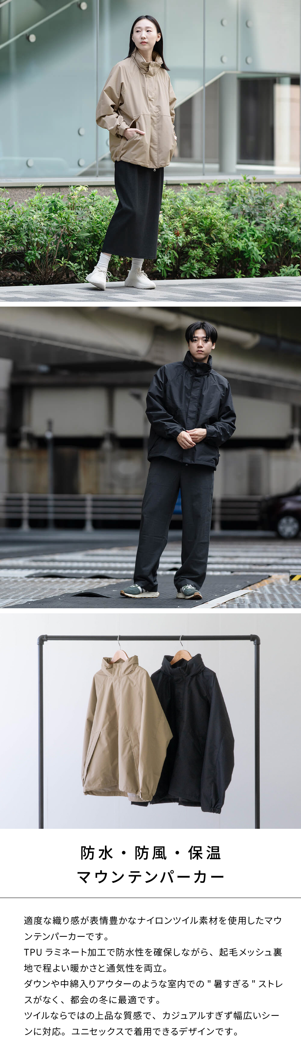 | 適度な織り感が表情豊かなナイロンツイル素材を使用したマウンテンパーカーです。 TPUラミネート加工で防水性を確保しながら、起毛メッシュ裏地で程よい暖かさと通気性を両立。 ダウンや中綿入りアウターのような室内での"暑すぎる"ストレスがなく、都会の冬に最適です。 ツイルならではの上品な質感で、カジュアルすぎず幅広いシーンに対応。ユニセックスで着用できるデザインです。 |