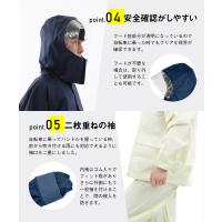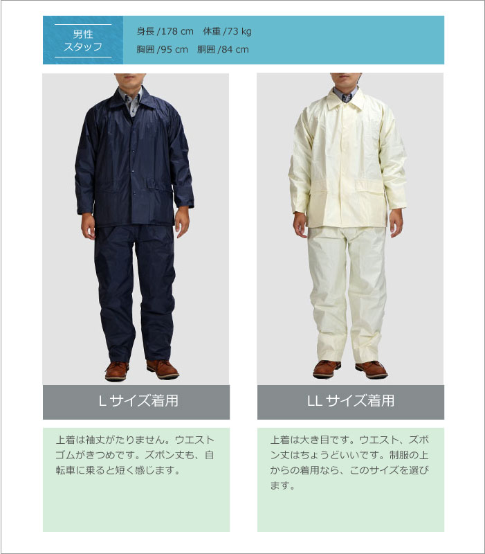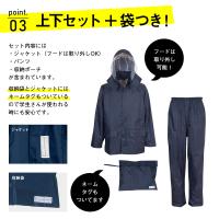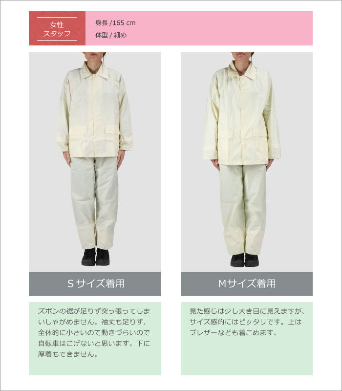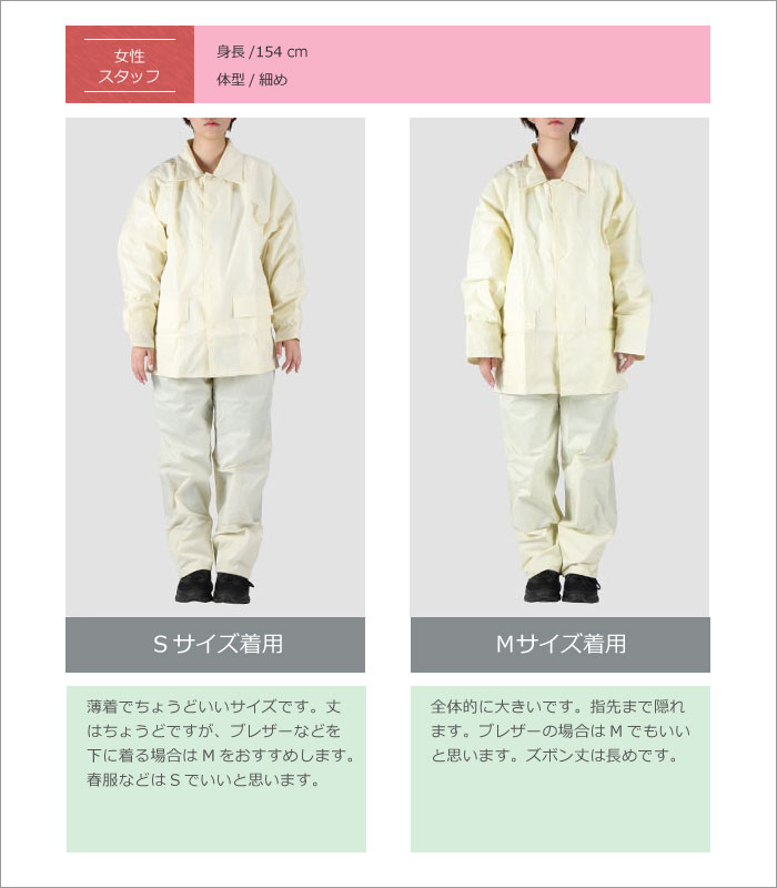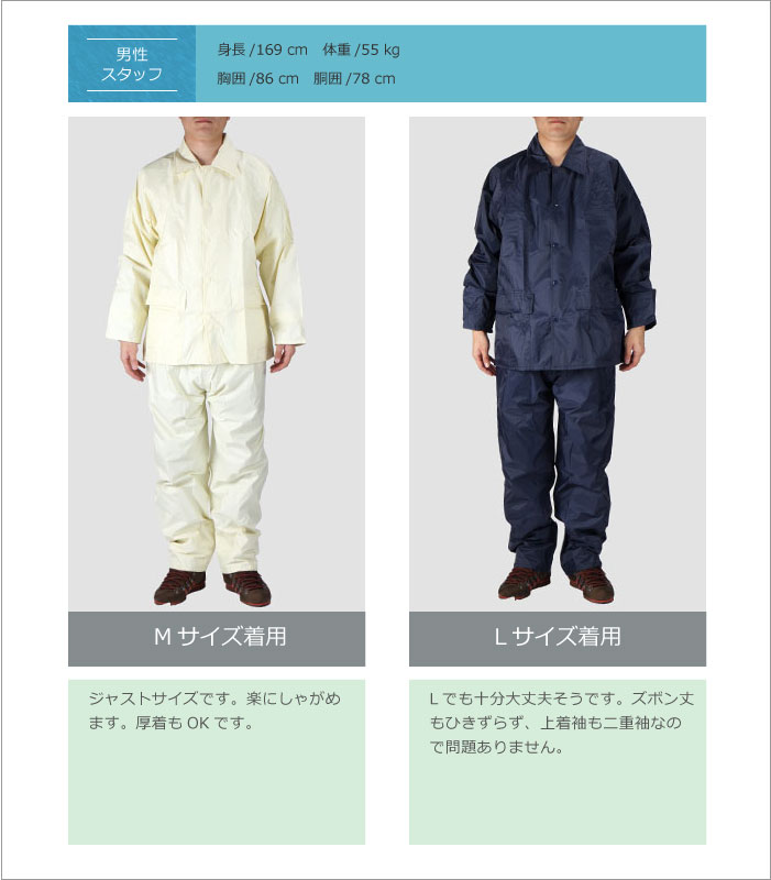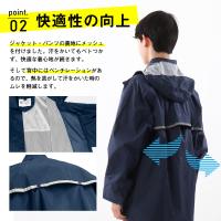 | 素材 | 表地:ナイロン100%(PVCラミネート) 裏地:ポリエステル100%(ジャケット・パンツ総裏メッシュ) |