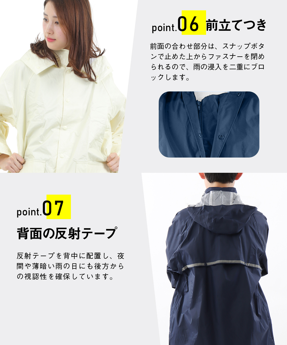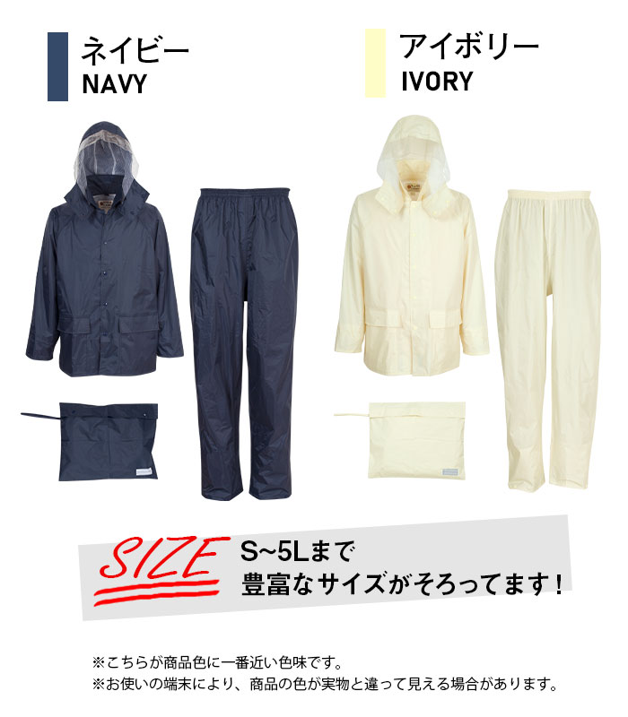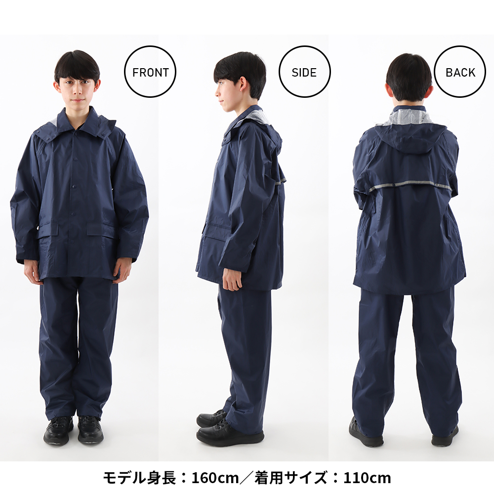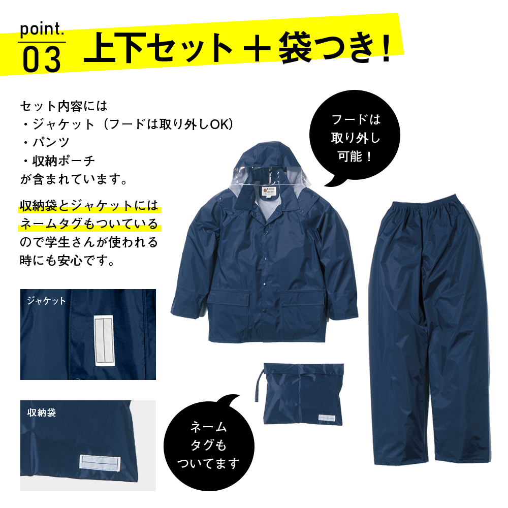 | 商品説明 | 学校指定のような落ち着いたデザインのレインスーツです。オシャレなレインウエアはスポーツ用品店などに行けばたくさん並んでいますが、学生さんの定番レインウエアって実店舗で売っているのをあんまり見かけませんよね。そういう事情もあってか、結構ネットで探されている方は多いんです。自転車通学の方は雨が降ってしまうと傘差し運転は出来ないので、レインウエアは必須アイテムですよね。このシリーズは当店でも1、2を争う超ロングセラー商品です。シンプルなデザインでも安全性と防水性は折り紙つき。フードは被った時の視界を妨げないよう、前方部分はクリア素材で作ってあります。取り外し可能なのでヘルメットをかぶった時は、ジャケットだけでも使用できますよ。袖口は二重になっていて、自転車のハンドルを持った手元に前からふき付ける雨の浸入を防いでくれます。前合せの部分はファスナーの上からスナップボタンで止める二重前立てで雨の浸入をブロック。夜間の視認性を向上させるため、背中には幅広の反射テープを付けました。ジャケット、パンツともに通気性のいい総裏メッシュを採用しているので、汗をかいても不快なベタつきが軽減され快適な着心地が続きます。さらに背中にベンチレーションを付けることで、ムレの緩和も。学校での使用を意識して名前の記入ラベルを付けたり、収納用にレインウエアと同色の袋も付属しています。シンプルなデザインながらも中高生の自転車通学をされている方に必要な機能を盛り込みました。カラーは通学でも違和感のないアイボリーとネイビーの2色をご用意しました。時代は変わっても、自転車通学に求められる基本的性能には大きな変化はありません。だからずっとずっと昔からの定番なのかもしれませんね。 |