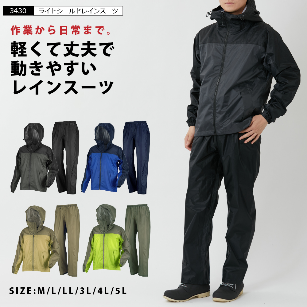 防水性の高いPVCラミネートを採用し、動きやすいレインスーツです。従来のPVC素材よりも40%軽量化を実現。豊富なサイズとシンプルなデザインで幅広くお使いいただけます。表地は信頼の防水性、耐水圧15,000mm。ジャケットのみ裏地にメッシュを設置しています。※パンツは裏地無し。ジャケットは肩・肘を動かしやすいクライミング3Dカッティングを採用し、本格アウトドア並みの立体裁断で動きやすさを追求しました。襟元も高めに設計してあるので吹き込む風雨も軽減してくれます。ジャケット後方には安全性を高めるリフレクタープリントで夜間や薄暗い雨の日でも安心。ヘルメットにも対応する大型フードは、面ファスナーで深さ調節が可能です。顔周りもサイドのゴムを引くことでフィットさせることができます。Sサイズから4Lサイズまでの豊富なサイズ展開で、女性にもおすすめ。ブルーのみ5Lサイズもあり、大きなサイズをお探しの方にも。軽くて丈夫で動きやすく、通勤・通学や作業用など幅広くお使いいただけます。ちょっと小雨の日にジャケットだけを使用したり汚れやすい作業や洗車の時にズボンだけを使用したりと、普段使いもしやすい一着です。 |
